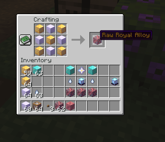 Step 1. Using a crafting table put Heavy Blue Gold in an X shape then fill the rest of the grid with Heavy Copper Alloy. You will receive a block of Raw Royal Alloy.